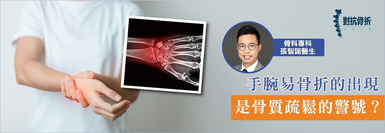 手腕骨折通常發生在跌倒時本能地用手支撐地面,導致橈骨末端承受過大力量而骨折。除了因運動撞傷、滑倒或交通事故引起,也跟年齡及骨質疏鬆相關1,2。隨著年紀老化,鈣、磷等礦物質含量減少,骨小樑變得疏鬆,抗骨折能力會下降。很多時候,患者到發生骨折後,才發現自己已患上骨質疏鬆。