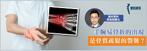 骨質疏鬆沒有症狀,不會引起疼痛,因此不易被察覺。然而,在低創傷的情況下,比如在平地跌倒就已骨折,很可能就是骨質疏鬆的警號。早前一位六十多歲的女病人在浴室滑倒後手部腫脹變形,被診斷為遠端橈骨骨折及骨質疏鬆,需接受手術及藥物治療。手術後,雖已不需特別固定患處,但仍需進行疼痛管理和炎症控制,並避免過早或不當的活動,以免影響骨骼癒合。